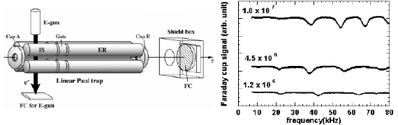 当研究室で開発したタンデム型linear Paul trapにおける荷電粒子閉じ込めの基礎特性(軸方向の非線形共鳴振動、径方向密度分布、等)を調べるとともに、小型で安価な多価イオン源への応用、さらには加速器シミュレーターとしての応用のために研究開発を進めています。左下図はlinear Paul trapの模式図で、右下図はlinear Paul trapにおける軸方向の非線形共鳴振動の計測例です。